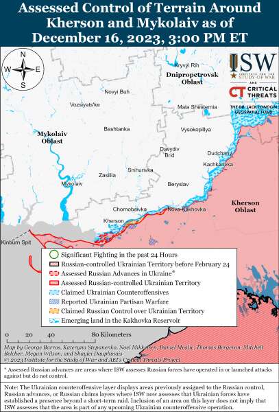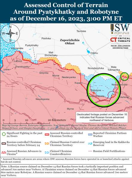 Українські війська 16 грудня продовжували контрнаступальні дії в районі Роботино на заході Запорізької області, але жодного підтвердженого наступу не вчинили.