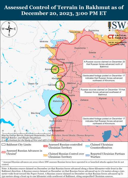 Геолокаційні кадри, опубліковані 19 грудня, показують, що російські війська незначно просунулися на південний захід від Спірного (25 км на північний схід від Бахмута).