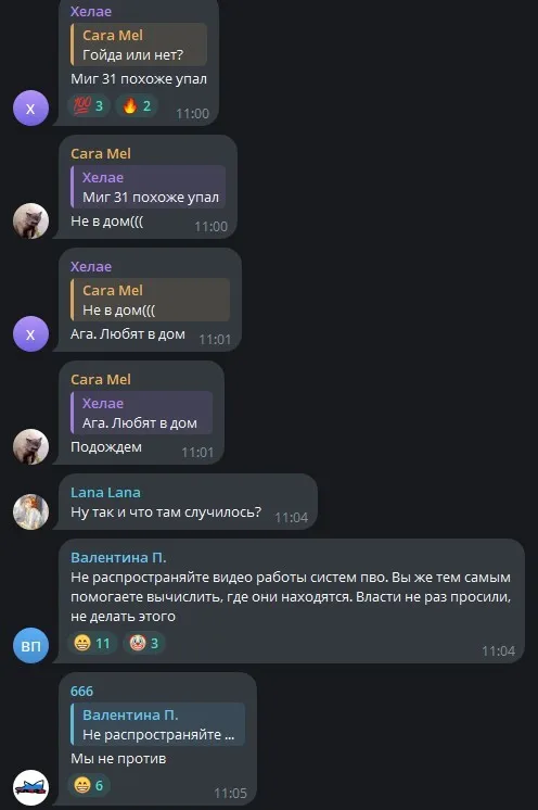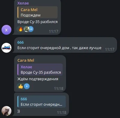 "Міг-31, схоже, впав", "Ніби Су-35 звалився", "Але спершу у вповітрі загорівся, пишуть. Напевно, ППО роз’ї*ала його", "Літак у повітрі загорівся і впав на берег моря", "Якщо згорить черговий будинок, то так навіть краще", "Вертоліт і швидкі у бік моря помчали", "Пілот потонув, що там швидким робити", – писали росіяни.