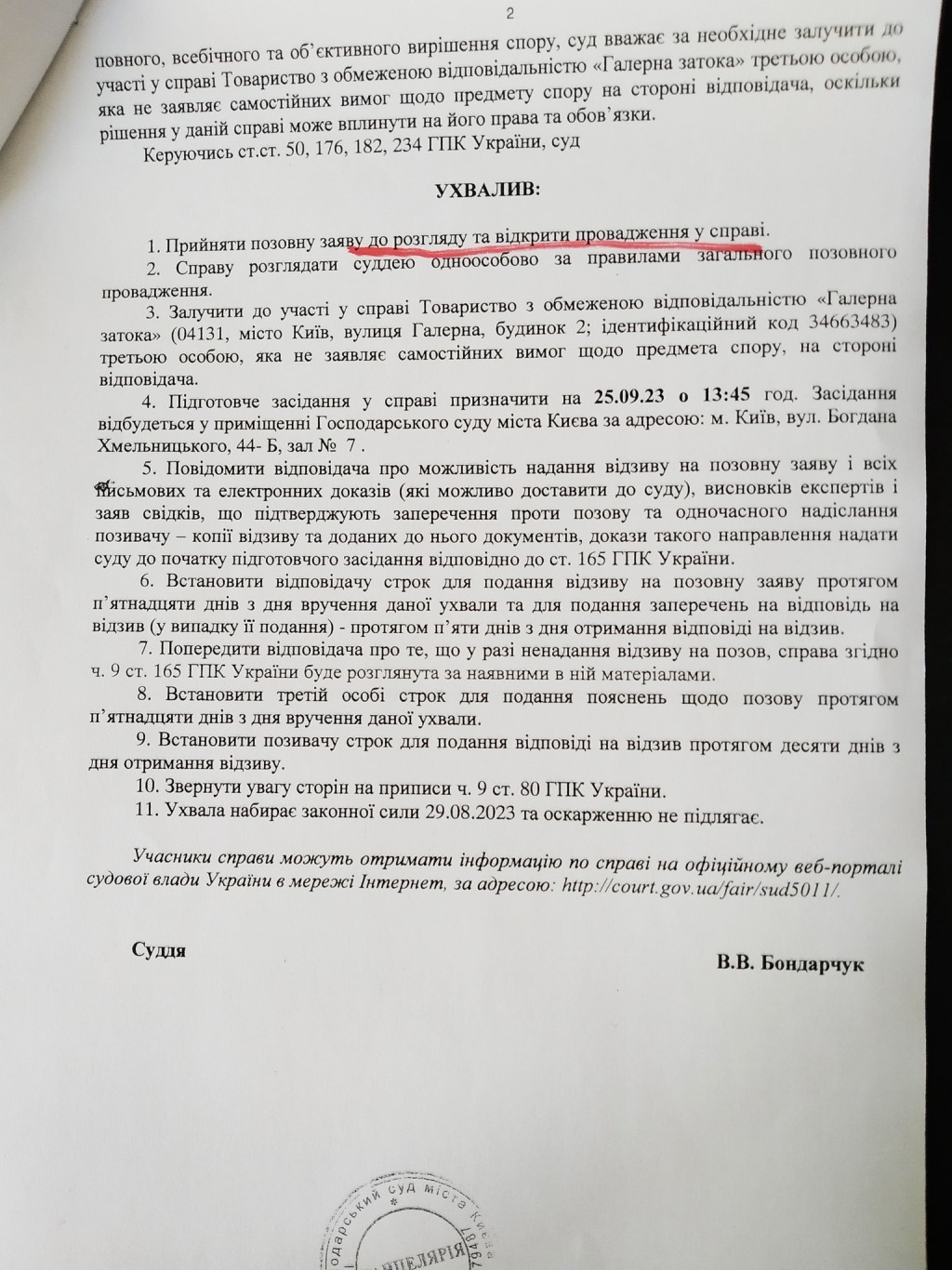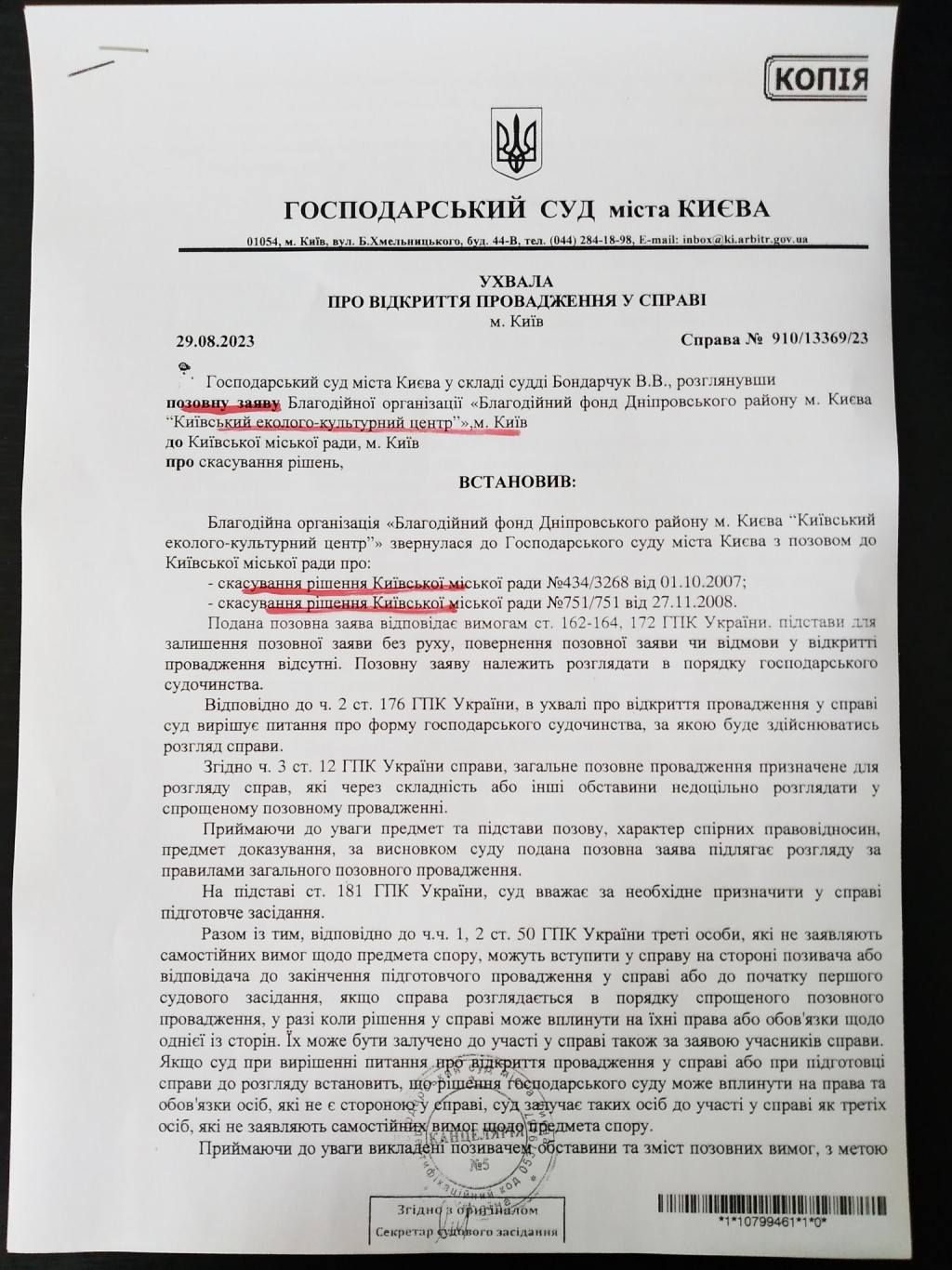 “Суддя Господарського суду Києва В. Бондарчук днями відкрив судовий розгляд позову Київського еколого-культурного центру (КЕКЦ) проти Київради та забудовників з ТОП “Галерна затока””, – йдеться в повідомленні.