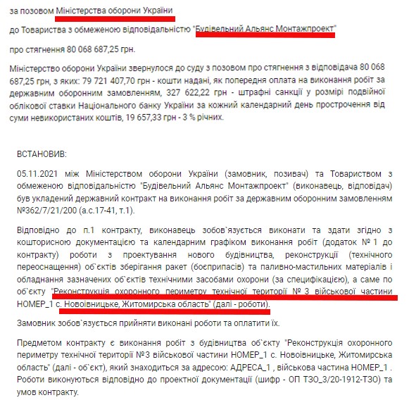 Цікаво, що до цього кейсу Міноборони вже мало неприємну справу з фірмами Гринкевича і навіть судилось з ними щодо невиконання договорів. Так, наприклад, Міністерство оборони України звернулося до суду з позовом про стягнення з ТОВ «Будівельний Альянс Монтажпроект» 80 мільйонів гривень, з яких 79,7 – це кошти, які міністерство оплатило авансом за виконання робіт, і 328 тисяч – штрафні санкції. Згідно з контрактом №362/7/21/200 від 5 листопада 2021 року «Будівельний Альянс Монтажпроект» повинен бути провести реконструкцію охоронного периметру технічної території №3 військової частини в селі Новоівницьке, Житомирської області. Роботи не були виконані в строк і наскільки видно з судового реєстру, не завершені до сьогодні.