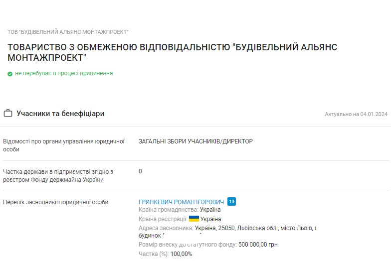 Згідно з даними відкритих реєстрів, засновником ТОВ «Будівельний Альянс Монтажпроект» є Гринкевич Роман Ігорович – син затриманого львівського бізнесмена. Він також є засновником благодійного фонду Hope.ua, який за свою волонтерську діяльність навіть отримував нагороду він Президента України.