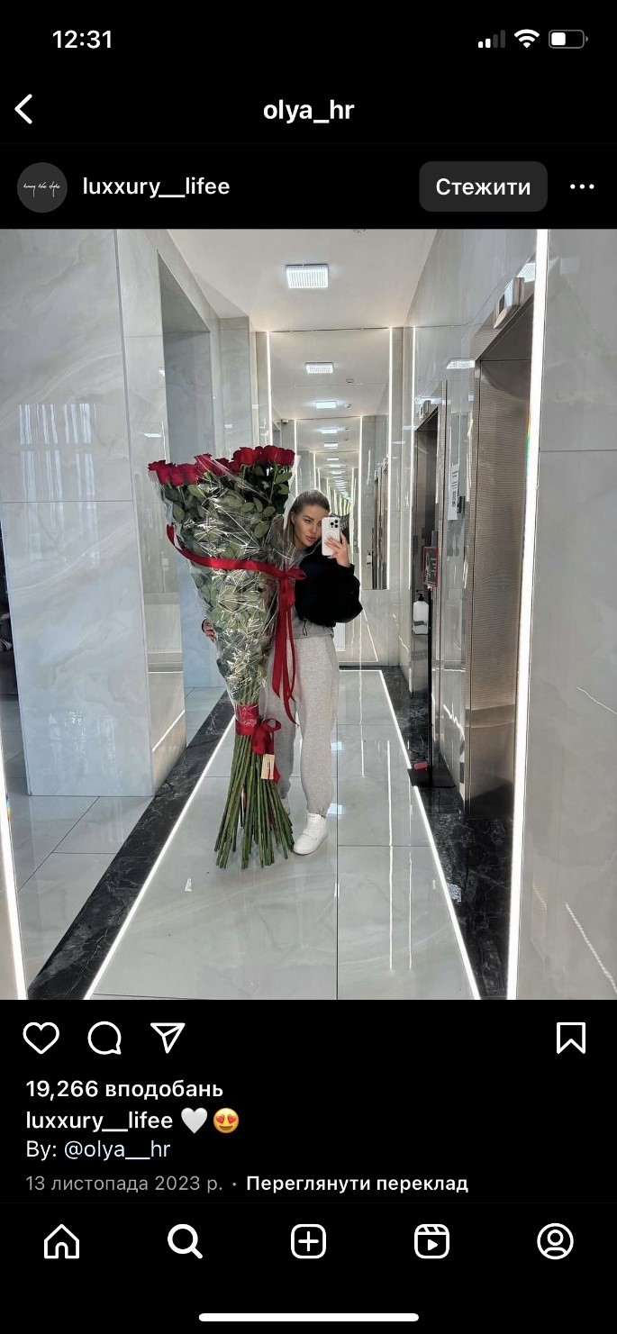 Зараз сторінка Морозюк в Instagram відкрита тільки для друзів. Але до скандалу всі охочі могли побачити, яке лакшері життя вела мисткиня разом із нареченим Романом Гринкевичем. Тут і Луї Вітон, і автівка в подарунок, й інші атрибути багатого життя.