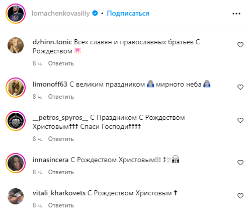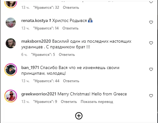 "Бог об’єднує нас, все, що нам потрібно, щоб зупинити братні війни між Росією та Україною", "За Росію", "Ти молодець, з різдвом тебе і всю твою родину, божого благословення і миру у ваш дім! Василь один з останніх справжніх українців. Зі святом, брате", – пишуть російською мовою фанати спортсмена.