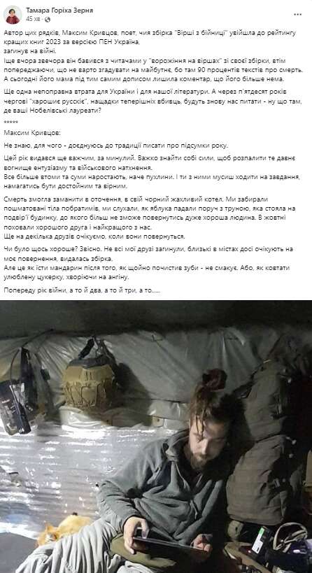 Повномасштабна війна, яку проти України майже два роки тому розв’язала Росія, забрала життя військового та поета Максима Кривцова. Ще вчора він спілкувався з підписниками, а 7 січня його матір повідомила про те, що він загинув.