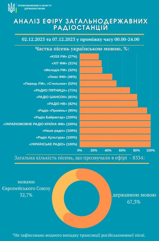 Секретаріат уповноваженого із захисту державної мови не зафіксував жодної російськомовної пісні на загальнонаціональних радіостанціях.