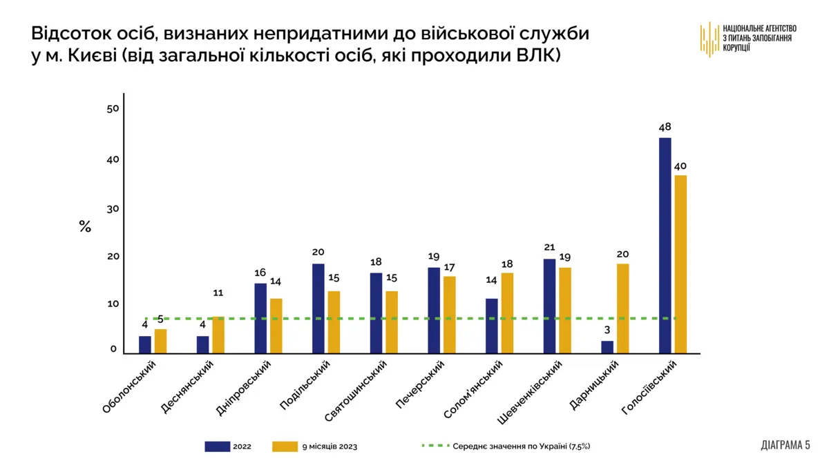 Короткий висновок. У 2022 році спостерігається значне перевищення середнього значення 7,5% (за період з 2022 до вересня 2023 р.) встановлення непридатності осіб до військової служби в Голосіївському (на 40.5 п.п.), Шевченківському (на 13.5 п.п.) та Подільському (на 12.5 п.п.) районах м. Києва. У 2023 році спостерігається значне перевищення вказаного середнього значення у Голосіївському (на 32.5 п.п.), Дарницькому (на 12.5 п.п.) та Шевченківському (на 11.5 п.п.) районах м. Києва.