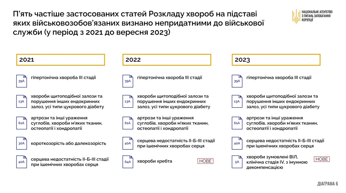 Короткий висновок: Чітко прослідковується щорічна зміна однієї з топ-5 статей Розкладу хвороб. Зокрема, у 2022 році хвороби хребта (ст. 64а) замінили короткозорість або далекозорість (ст. 30а), а в 2023 році хвороби, зумовлені ВІЛ (ст. 5а), замінили хвороби хребта. Варто також звернути увагу на те, що у 2022 та 2023 рр. до переліку п’яти найчастіше застосовуваних статей Розкладу хвороб входять хвороби щитоподібної залози (ст. 13а), гіпертонічна хвороба III стадії (ст. 39а) та серцева недостатність II-Б-III стадії при ішемічних хворобах серця (ст. 40а), діагностування та підтвердження яких є складним та потребує проведення значної кількості лабораторних та інструментальних досліджень. Зазначені хвороби також не мають яскраво вираженого зовнішнього прояву, що дає змогу використовувати такі діагнози для корупційних практик.