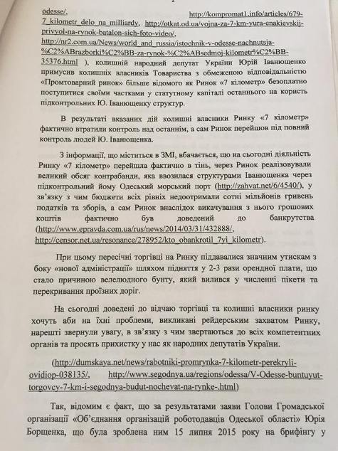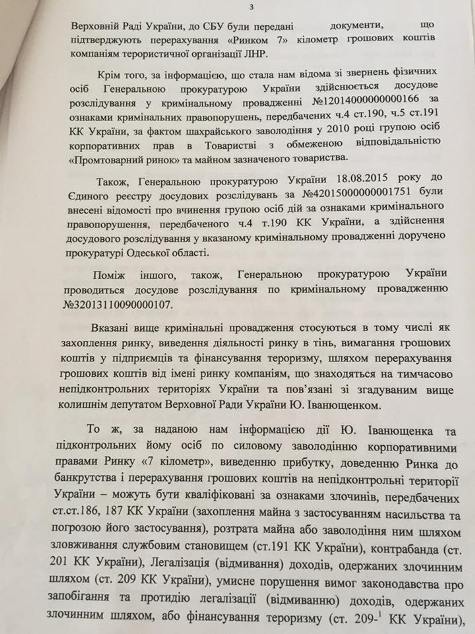 Депутаты перечисляют ряд уголовных производств, расследование по которым ведет Генеральная прокуратура, и утверждают, что они касаются, в том числе, «захвата рынка, вывода его деятельности в тень, вымогательства денег у предпринимателей и финансирования терроризма путем перечисления денежных средств от имени рынка компаниям, которые находятся на временно оккупированных территориях Украины и связаны с упомянутым выше бывшим депутатом Верховной Рады Юрием Иванющенко».