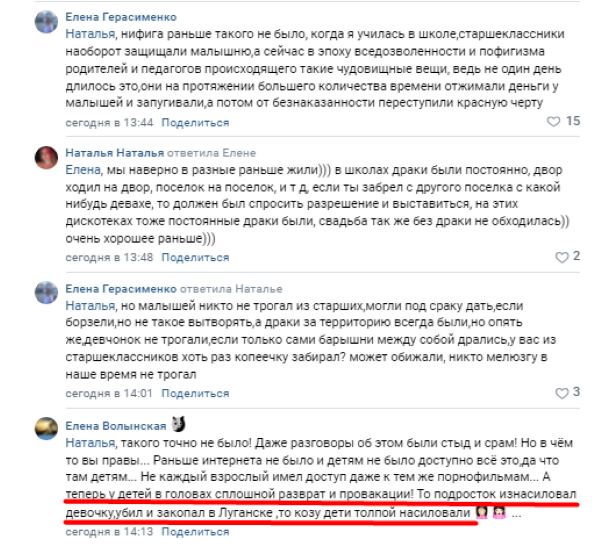 В ОРДЛО в школах виправдовується будь який злочин, бо «он сам виноват». Тобто усі жертви зґвалтування, боулінгу не мають жодного шансу на захист, бо суспільство завжди на стороні ґвалтівника та агресора.