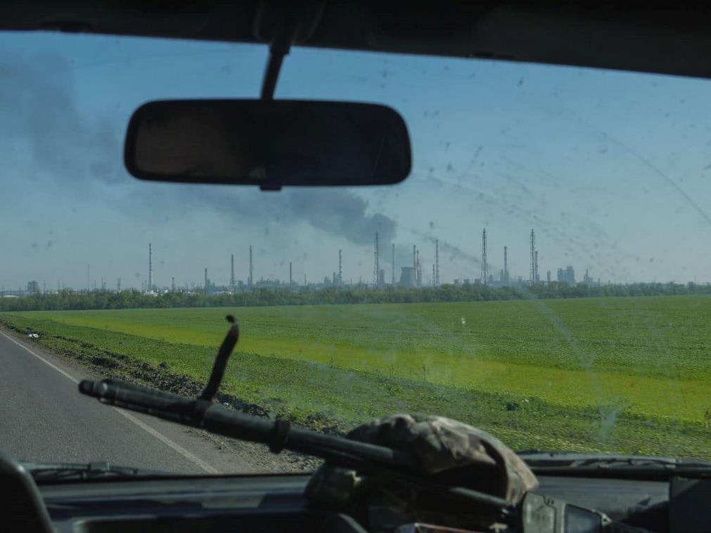 По дорозі на завдання. На горизонті – Лисичанський нафтопереробний завод. Травень 2022. Фото: Тарас Елейко