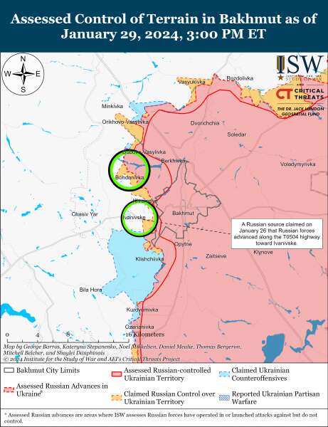 Міністерство оборони Росії стверджувало, що частини російського Західного угруповання військ нібито захопили Табаївку. ISW не спостерігала візуального підтвердження цієї заяви, а представник Сухопутних військ України підполковник Володимир Фітьо 29 січня повідомив, що у цьому районі продовжуються бої, але російські сили не захопили населений пункт.