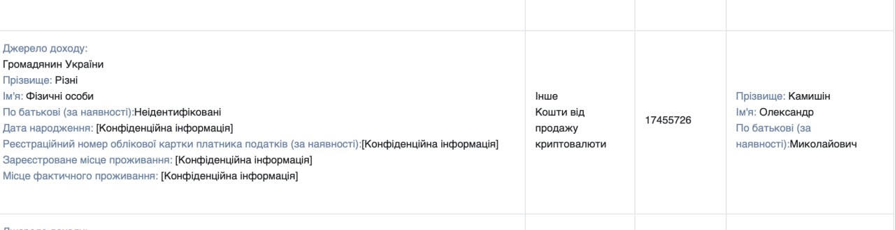 17,5 млн грн доходу від продажу криптовалют отримав міністр з питань стратегічних галузей промисловості Олександр Камишін.