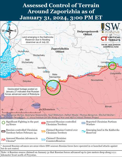 За словами ISW, 31 січня російські війська просунулися у прикордонному районі Донецько-Запорізької області.