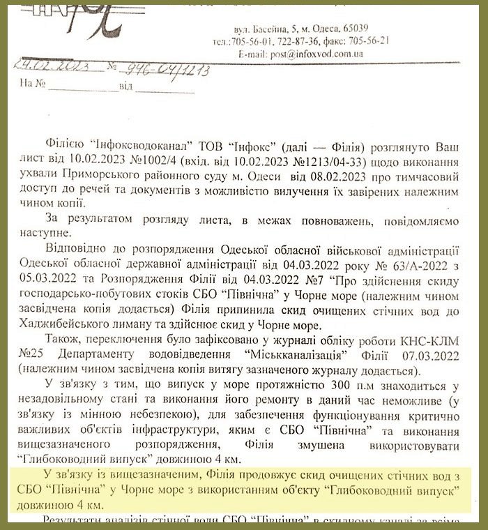 Також судом встановлено, що об`єкт «Глибоководний випуск» перебуває в належному стані, функціонує, використовується за призначенням та виконує свою безпечну та екологічну функцію.Так, після повномасштабного вторгнення Російської Федерації до України, за розпорядженням Одеської обласної військової адміністрації, скид всіх стічних (каналізаційних) вод м. Одеси з березня 2022 по теперішній час здійснюється саме через «Глибоководний випуск» в Чорне море”.