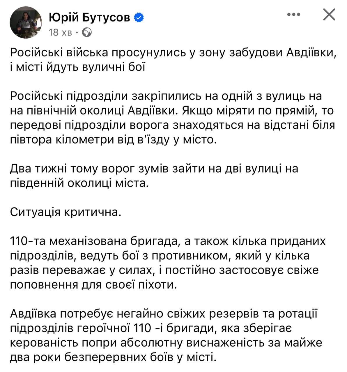 Журналіст Юрій Бутусов в Facebook пише про критичну ситуацію в Авдіївці.