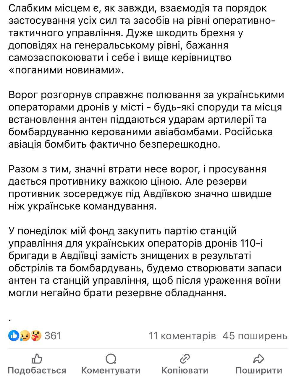 Авдіївка потребує негайно свіжих резервів та ротації підрозділів героїчної 110 -і бригади, яка зберігає керованість попри абсолютну виснаженість за майже два роки безперервних боїв у місті.