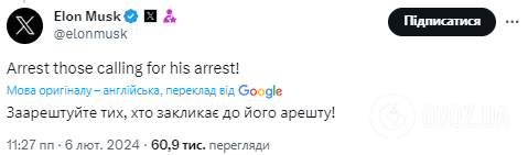 Маск відреагував на цей пост. Він написав короткий коментар: "Арештуйте тих, хто закликає заарештувати його!".