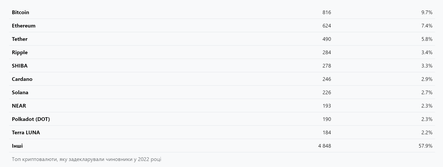 У деклараціях за 2021 рік найпопулярнішими криптовалютами серед українських чиновників були Bitcoin (BTC), Ethereum (ETH), Ripple (XRP) тощо. У 2022 році топ-позиції радикально не змінилися: попитом так само користувались Bitcoin (BTC), Ethereum (ETH), також до трійки лідерів додався Tether (USDT).