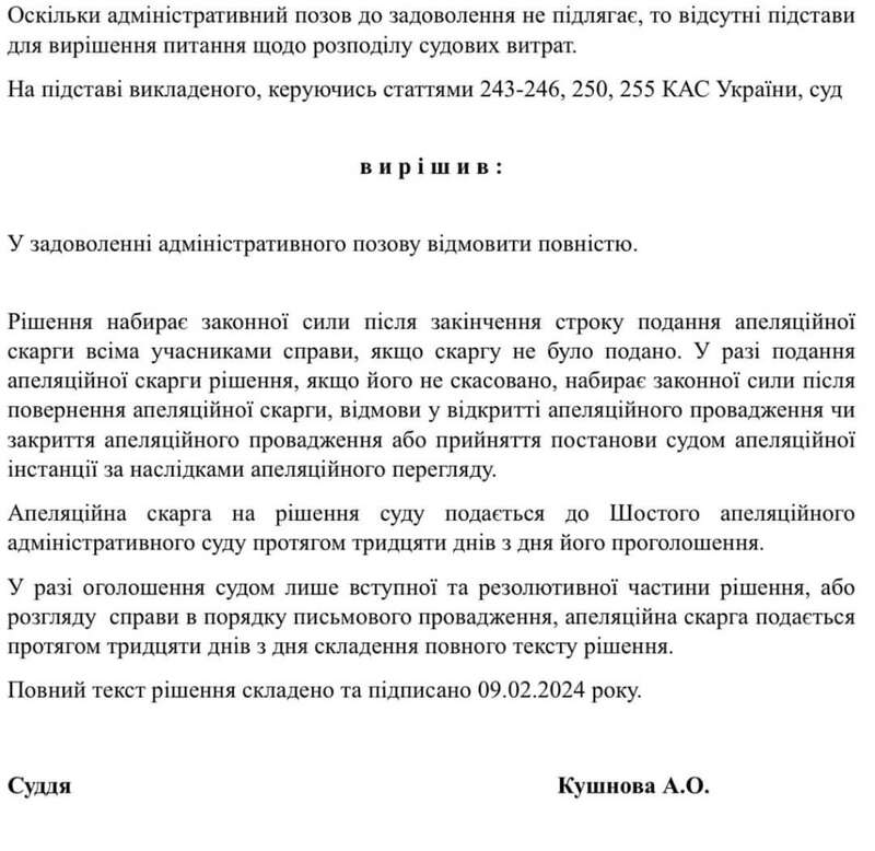 “І ось йому в задоволені позову відмовили рішенням від 09.02.2024 року”, – додав Роман Титикало.