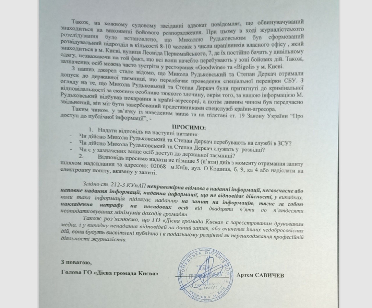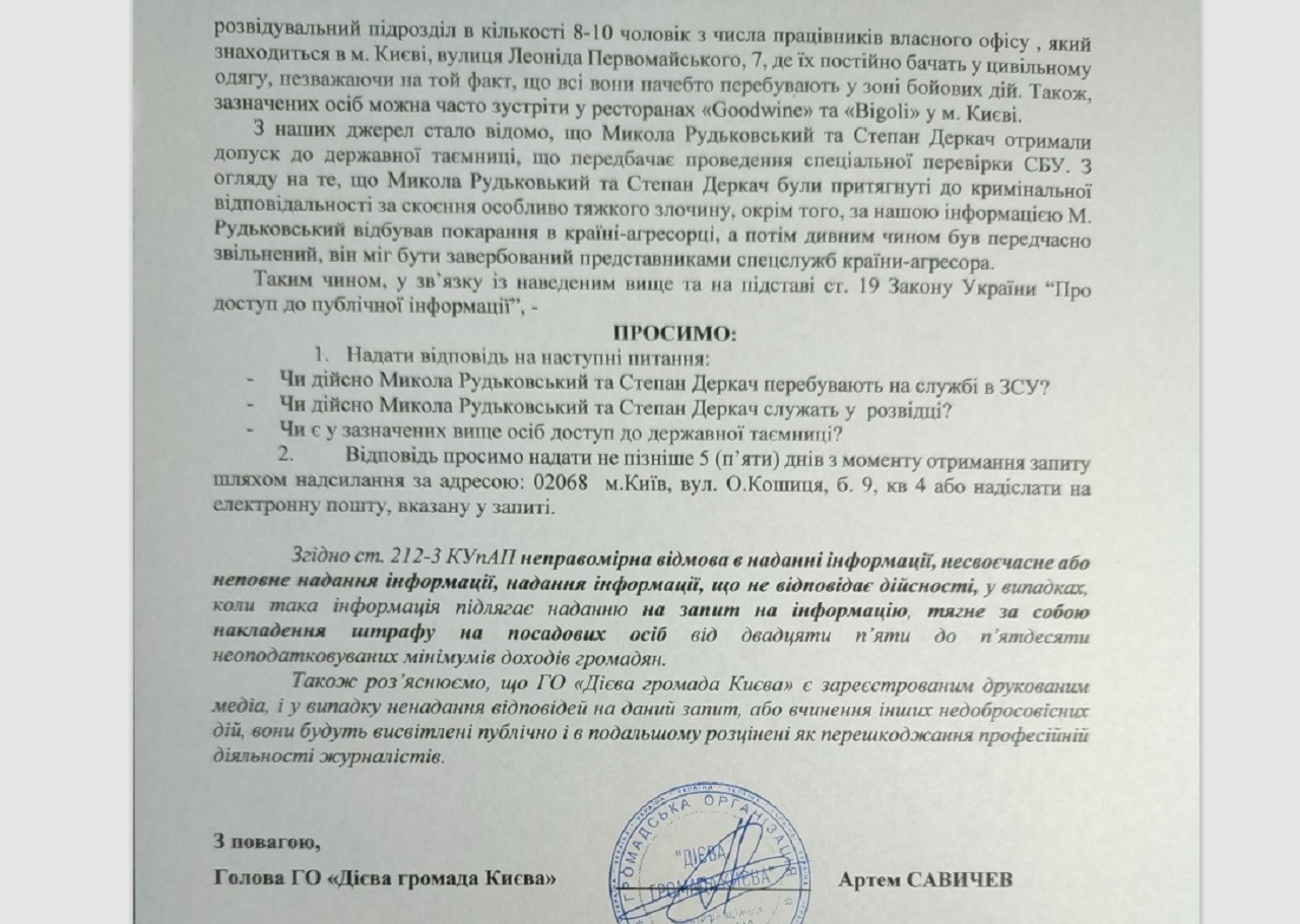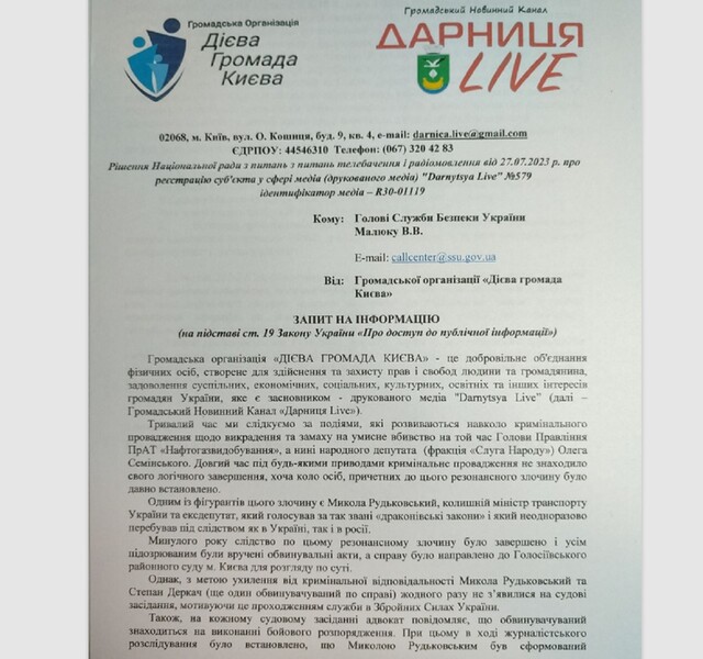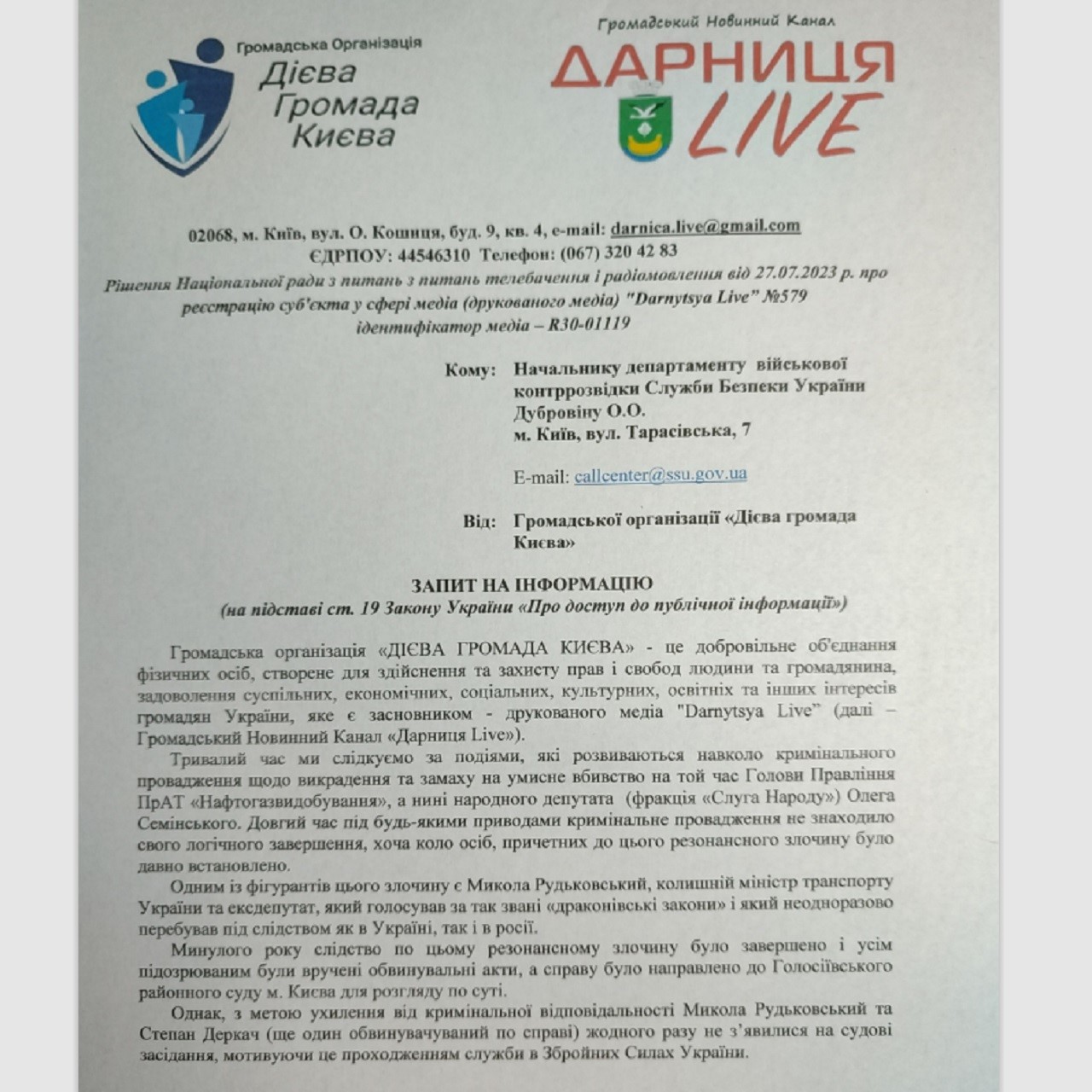Громадська організація "Дієва Громада Києва", яка є засновником медіа "Darnytsya Live", звернулася до Служби Безпеки України з офіційним запитом на інформацію щодо статусу колишнього міністра транспорту України Миколи Рудьковського та Степана Деркача у зв’язку з їхньою участю у кримінальному провадженні.