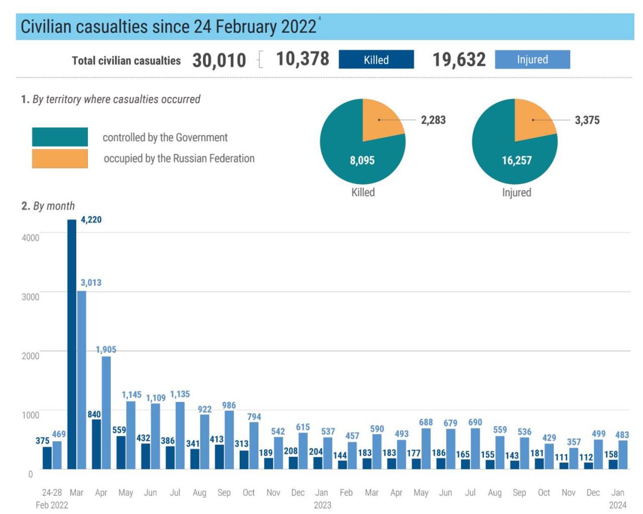 У січні війна забрала життя вже 158 українців, поранення отримали 483. Серед загиблих у січні - 40 дітей (порівняно з 18 у листопаді).