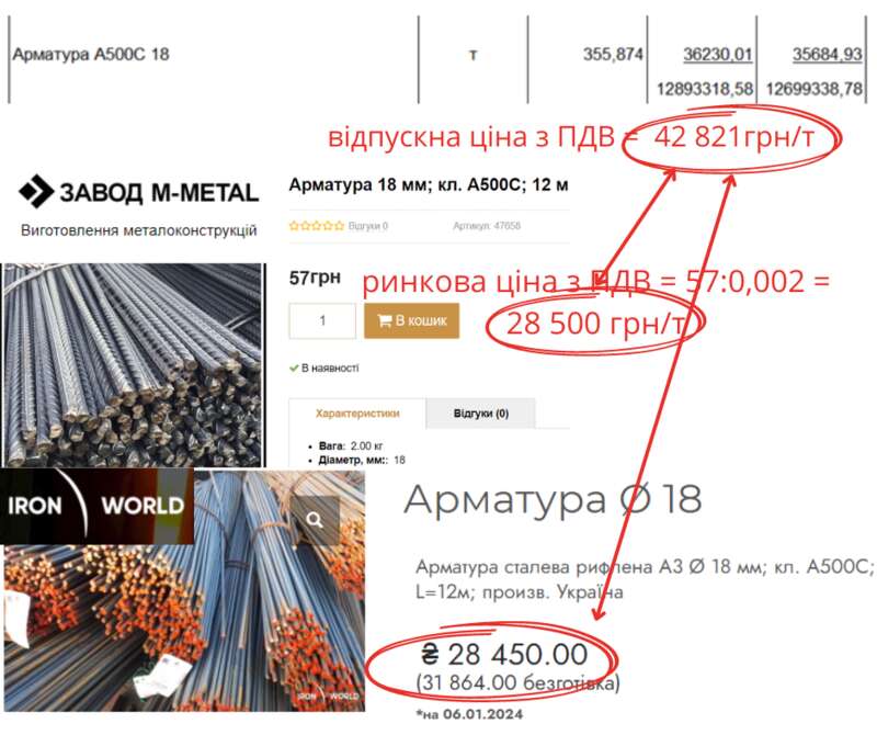 Арматуру класу А240С діаметром 8 мм врахували по 38 947 грн/т. «Iron World» продає таку арматуру по 29 904 грн/т, що на 26% дешевше. «Метінвест-СМЦ» пропонує її по 32 465 грн/т, що на 17% дешевше.
