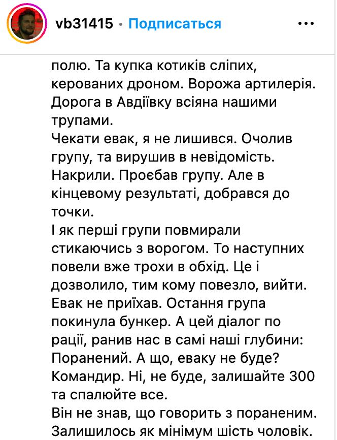 "Ніхто не любить непопулярних рішень. Виведення особового складу – ні. Інша справа, героїчна оборона. За це можна й підвищення отримати", – пише боєць.