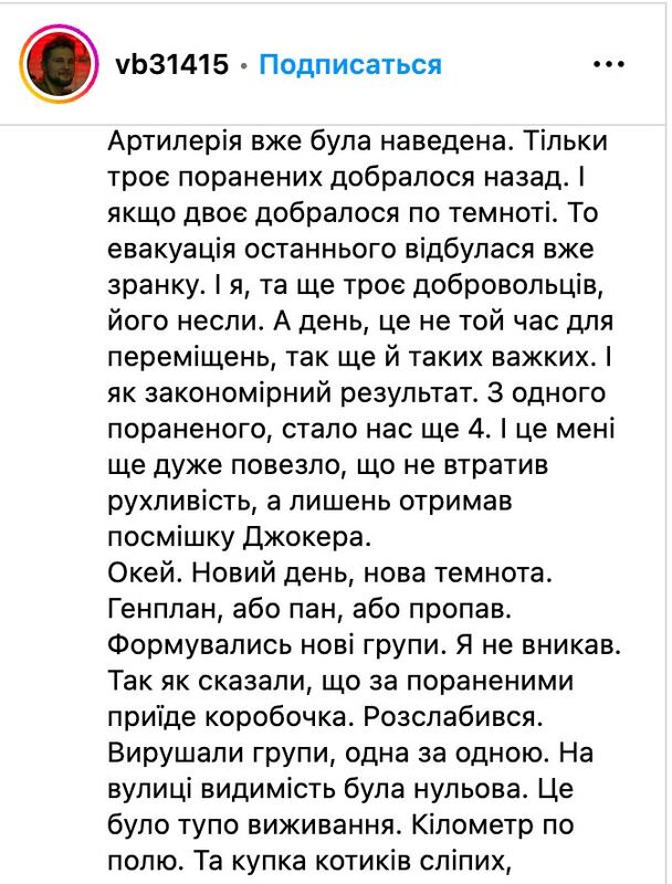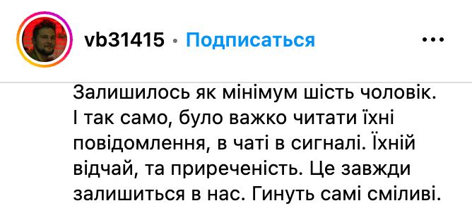 І так само було важко читати їхні повідомлення у чаті у сигналі. Їхній розпач і приреченість. Це завжди залишиться у нас. Гинуть найсміливіші", – пише Віктор.
