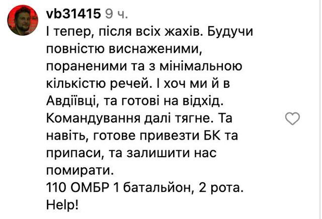 «Командування далі тягне. І навіть готове привезти БК і запаси, і залишити нас вмирати. 110 ОМБР 1 батальйон, 2 роти. Допоможіть!», – пише Віктор.