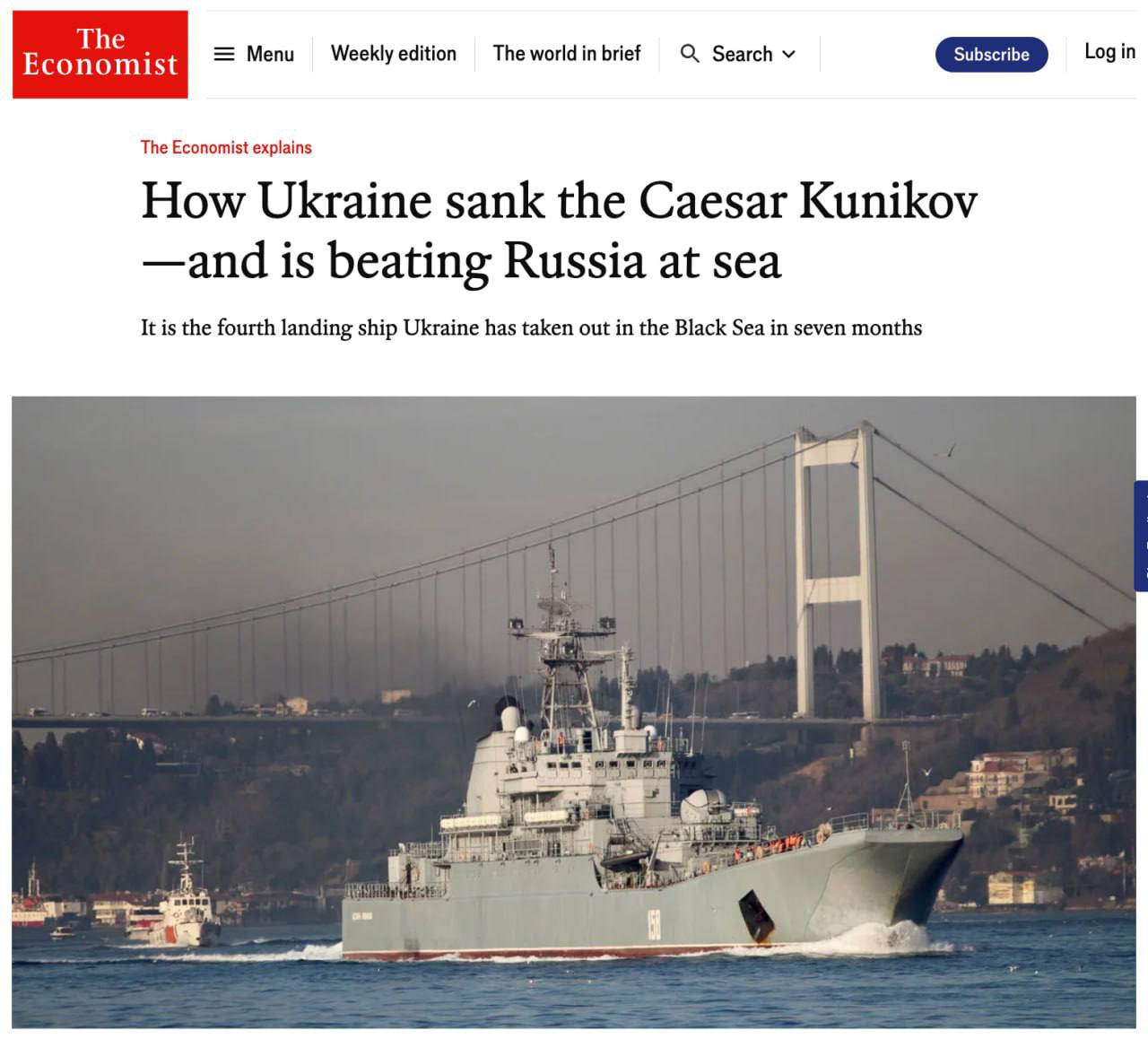 Поки перевага Росії в артилерійських обстрілах зростає, Україна перемагає країну-агресорку на морі, оскільки операції проти Чорноморського флоту РФ приносять «вражаючі результати», йдеться у матеріалі The Economist.