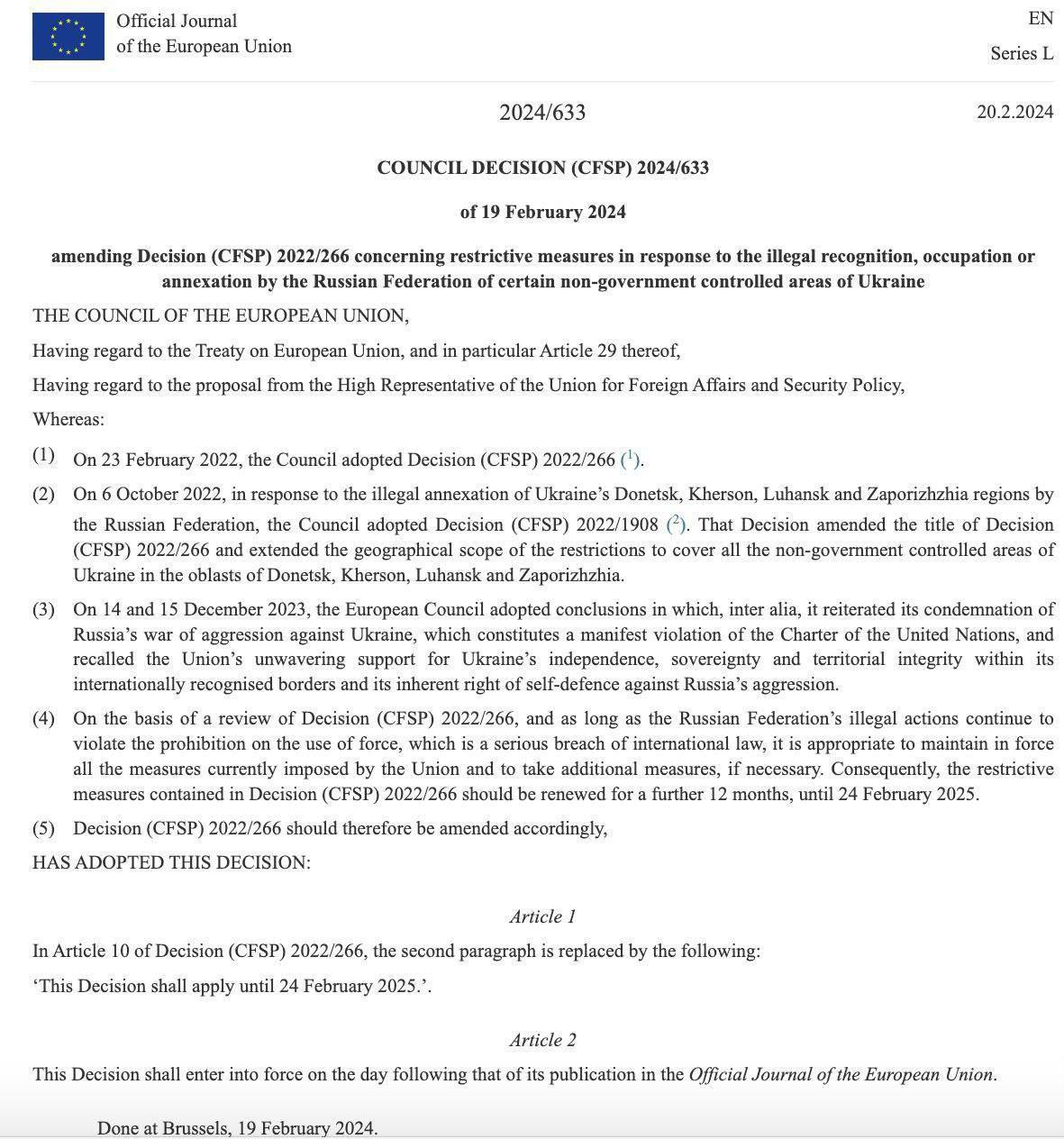 Рада Європейського Союзу продовжила дію санкцій проти Росії за окупацію територій України. Санкції діятимуть до 25 лютого 2025 року, йдеться в Офіційному журналі ЄС.