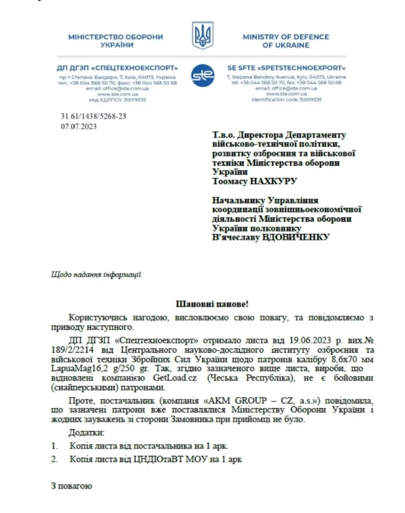 Не дивлячись на ці факти, AKM-group CZ активно весь 2023-й рік продовжувала укладати контракти із Міністерством оборони та державними спецімпортерами. У червні 2023 року державний спецімпортер під управлінням Головного управління розвідки «Спецтехноекспорт» звернувся на адресу департаменту військово-технічної політики, розвитку озброєння та військової техніки Міністерства оборони України із пропозицією здійснити постачання ВІДНОВЛЕНИХ патронів калібру 8,6х70 мм виробництва (відновлення) компанії GetLoad.cz через вже відому нам AKM-group CZ.