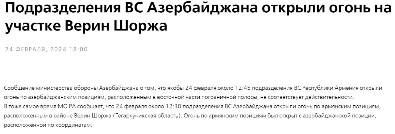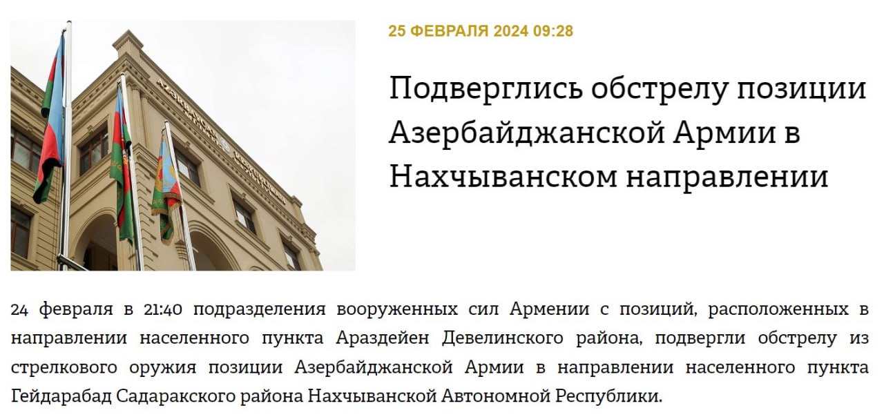 Вірменські військові напередодні заявляли, що Азербайджан вдень 24 лютого відкрив вогонь з вірменських позицій у районі Гегаркунікської області.