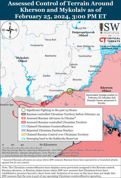 Українські та російські джерела повідомили про позиційні бої в Кринках, які продовжуються, незважаючи на заяви Росії про те, що російські війська повністю відбили населений пункт.