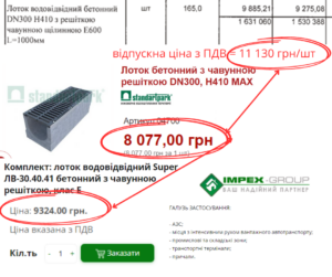 Ще 1,83 млн грн іде на водовідвідні бетонні лотки DN300 H410 зі щілинною чавунною решіткою Е600 L=1000 мм по 11 130 грн/шт. «Сучасний дім» пропонує такі по 8 077 грн/шт., що на 27% дешевше, а «Імпекс-Груп Україна» – по 9 324 грн/шт., що на 16% дешевше.