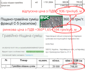 Крім того, 1,59 млн грн припадає на піщано-гравійну суміш по 936 грн/куб. м. Компанія «БУК» продає таку суміш по 360 грн/т, тобто 594 грн/куб. м, що на 37% дешевше. А чернівецькі шляховики зараз замовляють її у виробника по 748 грн/куб. м, що на 20% дешевше.