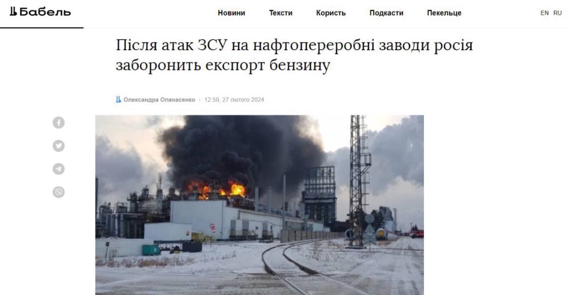 Їхні наслідки росіяни не можуть швидко усунути через санкції. У січні та лютому 4 нафтопереробні заводи були пошкоджені атаками дронів.