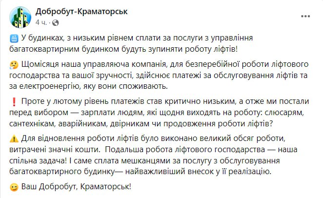 "Ми постали перед вибором - зарплати людям, які щодня виходять на роботу: слюсарям, сантехнікам, аварійникам, двірникам або продовження роботи ліфтів", - заявляє керуюча компанія.