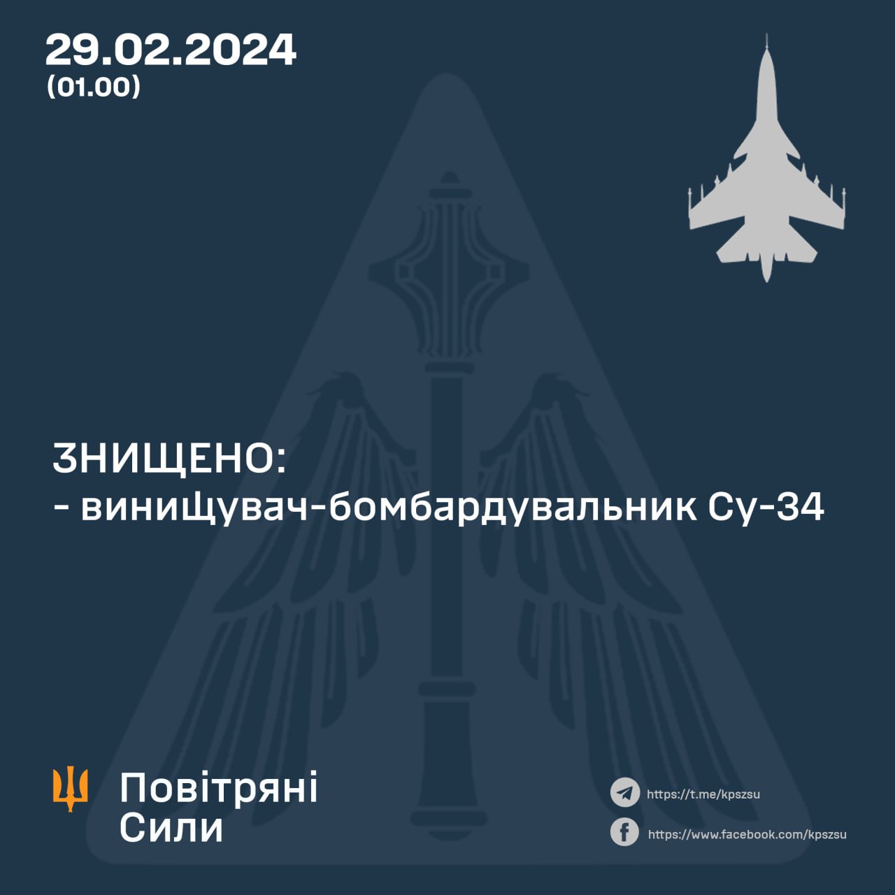 Українські військові сьогодні вночі, 29 лютого, знищили ворожий Су-34 на Східному напрямку.