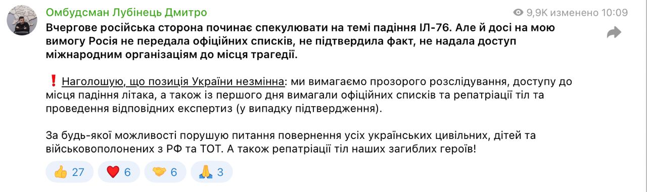 Омбудсмен Дмитро Лубінець прокоментував заяву РФ про готовність передати Україні останки українських полонених, які загинули, як стверджує Москва, під час катастрофи Іл-76 у Білгородській області.