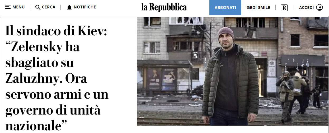 В інтерв’ю газеті La Repubblica він заявив, що після усунення Залужного Зеленський «мав пояснити причину рішення, яке шокувало кожного українця», «багато хто відчував розгубленість і розпач».