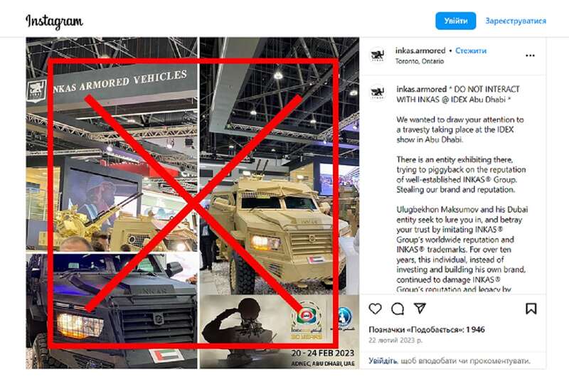 Так, канадська компанія попереджає на своїх офіційних ресурсах, що компанія "Інкас Дубай", яка продовжує презентувати свою продукцію на виставках під торговою маркою INKAS, є "пародією" на справжній бренд. Окремо згадується власник дубайської структури Улугбекхон Максумов.