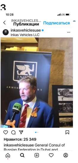 А це – головний російський консул в ОАЕ, який дає на фоні банера компанії Максумова інтерв’ю сумнозвісному телеканалу елітної російської пропагандистки Маргарити Симоньян. Дрескод все той самий – неодмінна "георгіївська стрічка", яка з 2014 року перетворилася на символ російської агресії.