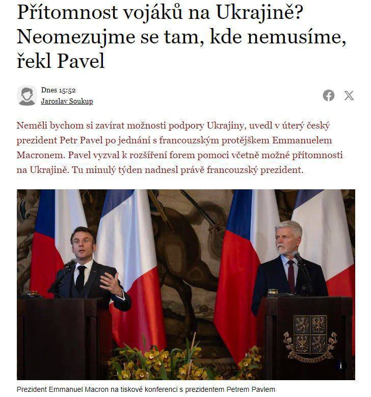 "Я за те, щоб шукати нові шляхи, включно з продовженням дискусії про можливу присутність в Україні. Давайте не обмежувати себе там, де ми не повинні. Ми самі вирішуємо, яку форму допомоги ми оберемо", — заявив Петр Павел на пресконференції з президентом Франції Емманюелем Макроном.
