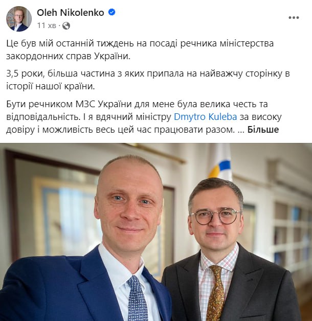 Речник МЗС Олег Ніколенко повідомив, що залишає посаду