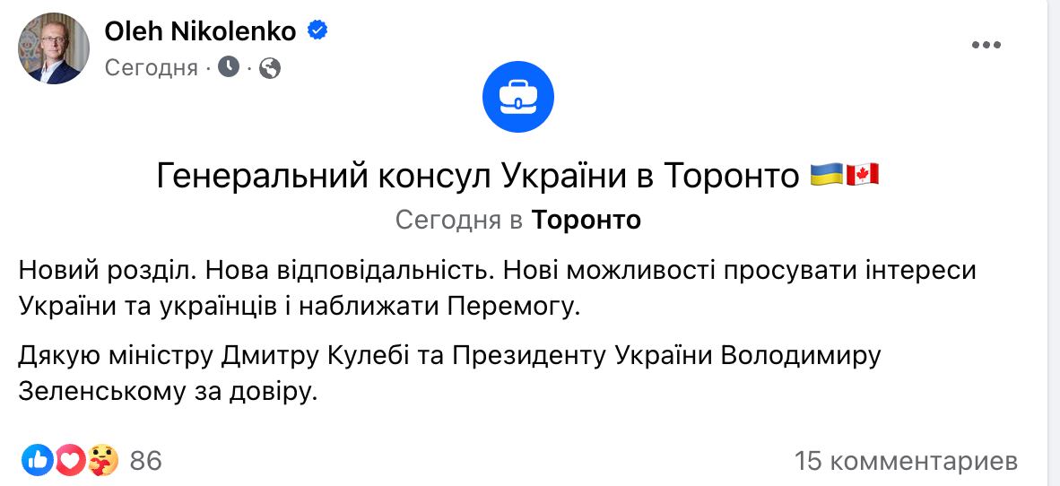 Про це Олег Ніколенко, який донедавна був речником Міністерства закордонних справ, написав на своїй сторінці у Facebook. Тепер він призначений на посаду генерального консула України в Торонто (Канада).