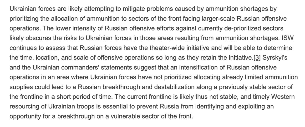 ISW зазначає, що українські військові, ймовірно, намагаються пом’якшити проблеми, спричинені нестачею боєприпасів і визначають пріоритетні ділянки на фронті.
