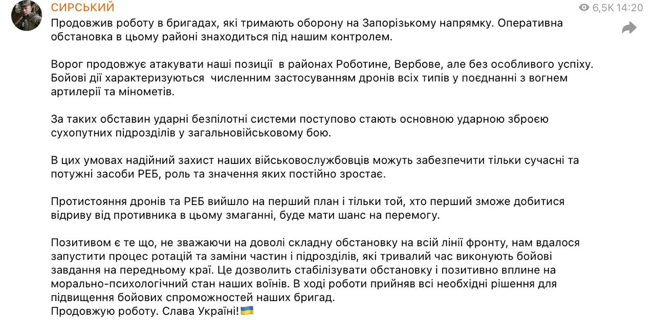 "Незважаючи на досить складну обстановку на всій лінії фронту, нам вдалося запустити процес ротацій та заміни частин та підрозділів, які тривалий час виконують бойові завдання на передньому краї. Це дозволить стабілізувати обстановку та позитивно вплине на морально-психологічний стан наших воїнів", - пише Сирський.