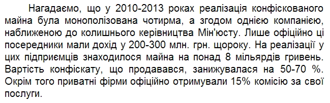 Цей меседж лунає мало не на кожній прес-конференції представників Мін’юсту і майже все в ньому правильно. Крім однієї деталі — реалізація конфіскованого майна не “була”, а й досі залишається монополізованою.